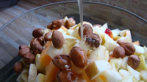 Narežite voće i dodajte sok iscijeđena limuna. Sadržaju pridodajte lješnjake i med.