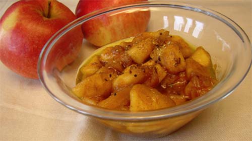 Jabuku oguliti, naribati ili narezati na sitne dijelove. U posudi zagrijati ghee te mu dodati sjemenke kumina. Kada kumin zamiriše, dodati mu jabuke i sve ostale sastojke (osim papra i soli). Smanjiti vatru i uz miješanje, sve sastojke lagano povezati. Kuhati uz dodatak soka ili vode, dok jabuka posve ne omekša. Posoliti, malo popapriti i poslužiti odmah.